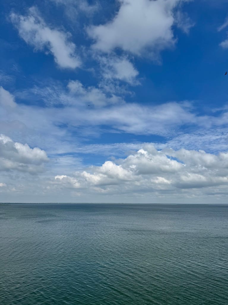The water stretched endlessly, still and blue, framed by rolling green and clouds painted in impossible whites. The sun had broken through at last, turning the grey of morning into something golden.
